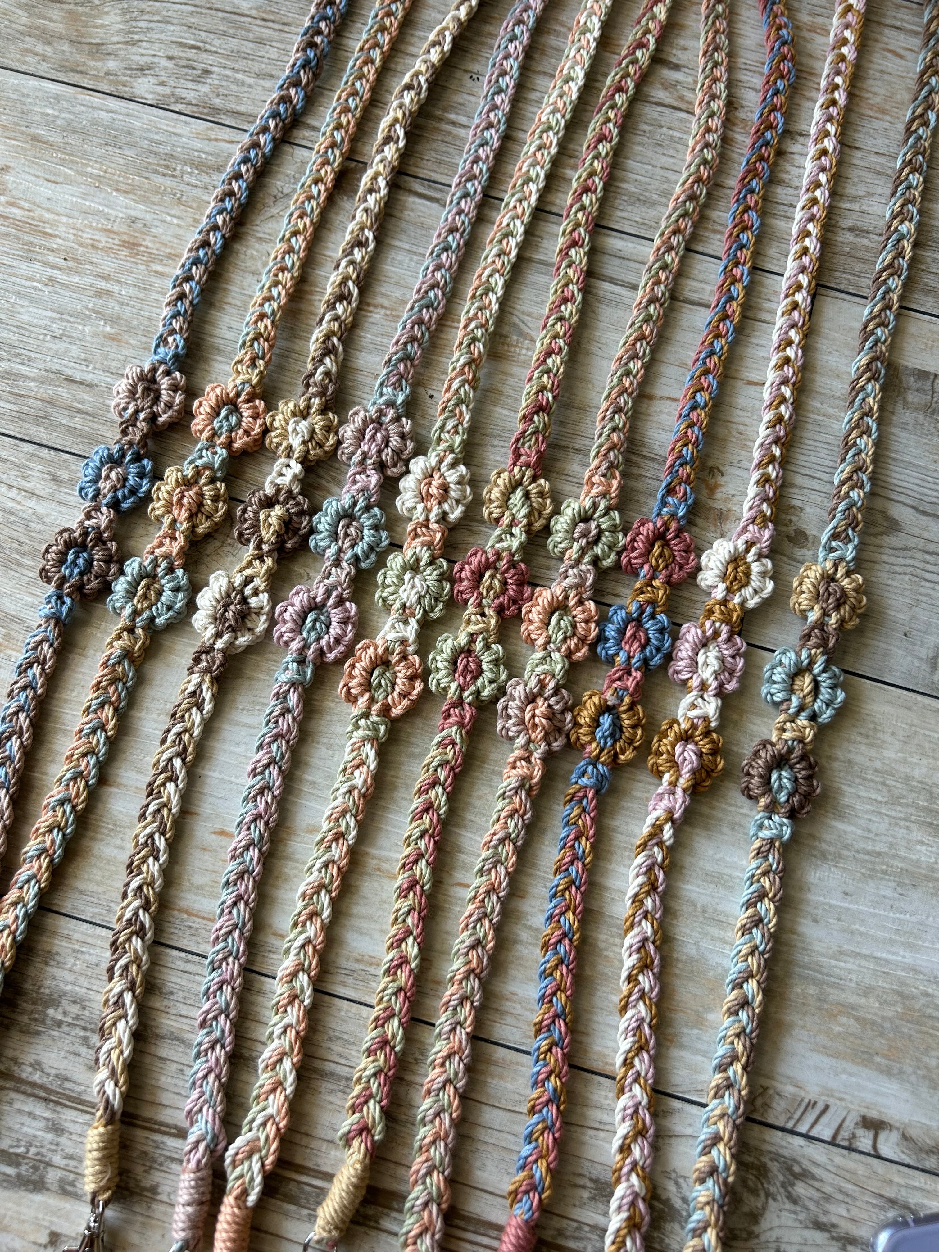 花が胸あたりにくるように1つ1つハンドメイドで編んだ便利なストラップ!!